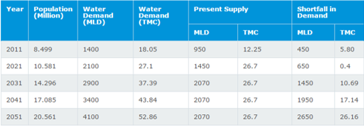 Bangalore city. The total installed capacity as of right now is 1310 MLD. Below given is the water supply requirements based on the future anticipated populations. Notice the amount of shorftfall in demand, which is already being experienced.