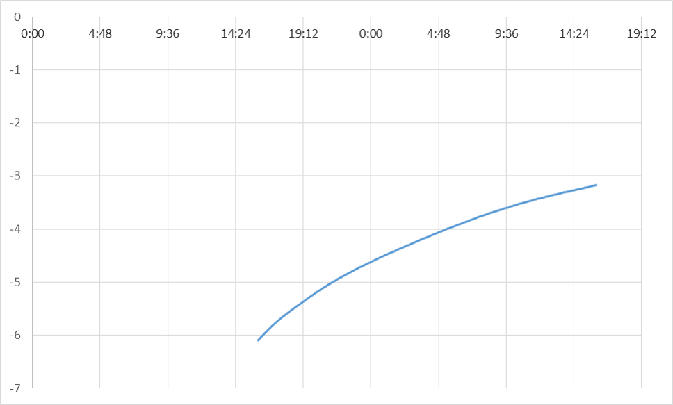 To understand the graph, picture 0 being ground level and the y axis variables signifying the depth at which water was found below the ground level. Therefore, more the water in the well, closer is the surface to the ground. As it can be inferred, around 4 m of water was recovered during the span of the sensor being installed. That amounts to a volume of around 6,600 L! It can also be noticed that the majority of the recovery occurs in the first 24 hours. Zooming in on that portion of the data for analysis.