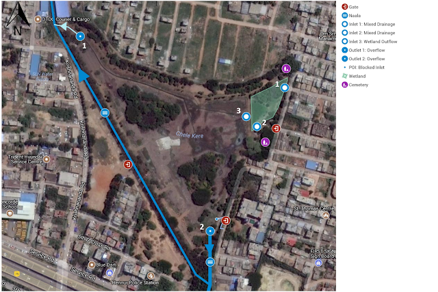 Some news articles have reported that there existed a bund in the SE side of the lake where an inflow of wastewater also existed and the bund was washed away by the inflow2. We noticed that the inflow had been closed by cementing the culvert thus diverting the entire wastewater flow to east and north directions (From MyMap – POI: Blocked Inlet). There are two inlet points into the wetland, one wetland overflow into the lake, and two outlets from the lake.