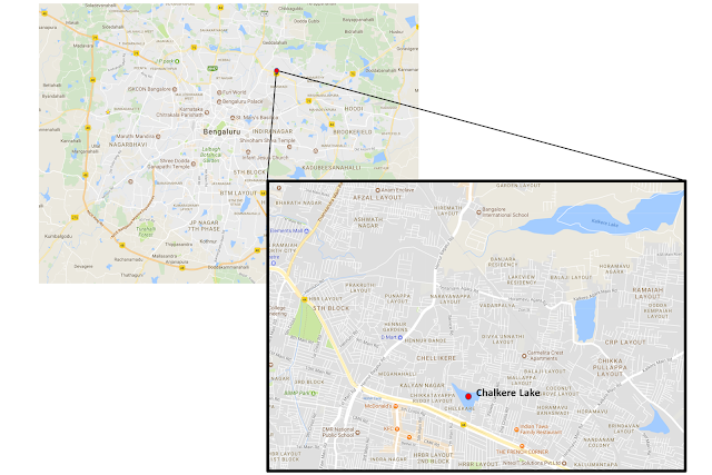 Challakere (Chalkere) Lake is on 38 acres and is located in the northeast part of Bangalore near Hennur Police Station. Chalkere is part of the Yellamallappa Chetty lake series within Hebbal Valley, overflowing into the downstream Ramapura Lake and eventually Yellamallappa Chetty Lake. During our visit on 4 August 2017, we observed that it is frequented by a few local residents who enjoy the provided walking path. There is no STP within the lake premises. However, there exists a wetland at the NE corner of the lake. Wastewater flows through two inlets into this wetland from the NE direction which then enters into the lake through a culvert. In total, there are two inlet points into the wetland area, one inlet into the main lake, and two outlets from the lake.