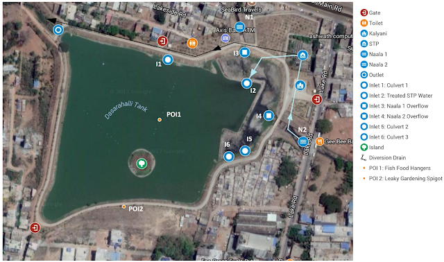 Dasarahalli Lake is situated on approximately 20 acres of land located in Dasarahalli, Bangalore just south of the Dasarahalli Metro Station. A 1 MLD STP was constructed in 2013 which discharges treated water into the lake. In addition to the treated STP water, there are five more inlets into the lake – all of which would discharge untreated storm and sewage water into the lake. Water from the naalas which is in excess of the STP’s capacity will flow through a diversion culvert to the next lake. During our visit on 4 July 2017, we observed that there are no constructed wetlands but one region that is separated from the main lake body in order to capture trash and other debris without letting it enter the lake. Note for map below – N: Naala, I: Inlet, POI: Point of Interest. Map labels match up with corresponding legend element. Top of map is north.
