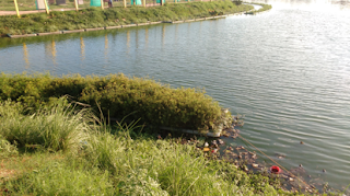 There is a motorable road around the lake. About half of the lake perimeter is fenced. There exist a childrens play area and a plan to install benches around the lake. Many shrubs, flowering plants and about 300 trees are planted around the lake. There is one primary inlet through which the sewage from the SW direction. The only outlet from the lake is located in the NE. Although there are fishes in the lake, no commercial fishing takes place. There are three gates around the lake to prevent the cows coming in and grazing. There are five people who work at the lake to maintain it.