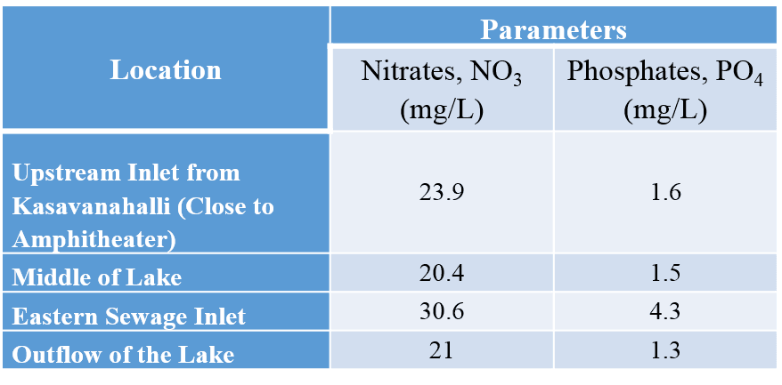 Karnataka State Pollution Control Board (KSPCB) have standards of the quality of water that must be maintained in the output of sewage treatment plants, post treatment. The standard for Phosphates is given to be a maximum of 5 mg/L  and no standard as of yet is adopted by KSPCB with respect to Nitrates.