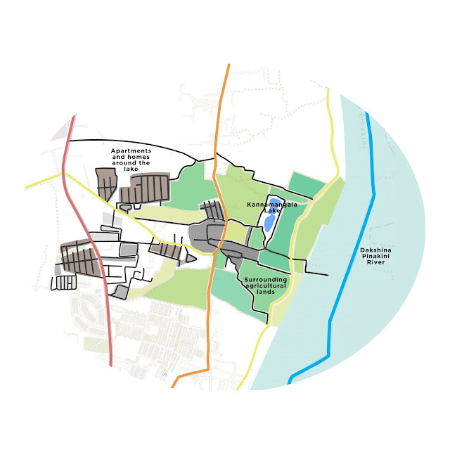 | Kannamangala lake in the context of the neighbouring agricultural lands, villages and apartment complexes. |