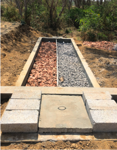 Within this space, we will run a series of experiments with jelly stones and terracotta rubble materials. The first treatment will test the removal of organic contaminants by means of jelly and Terracotta rubble material. Terracotta has properties which makes it a viable biofilter media for urban wastewater. We plan to test the system for flows between 2.4 and 9.6 KLD.