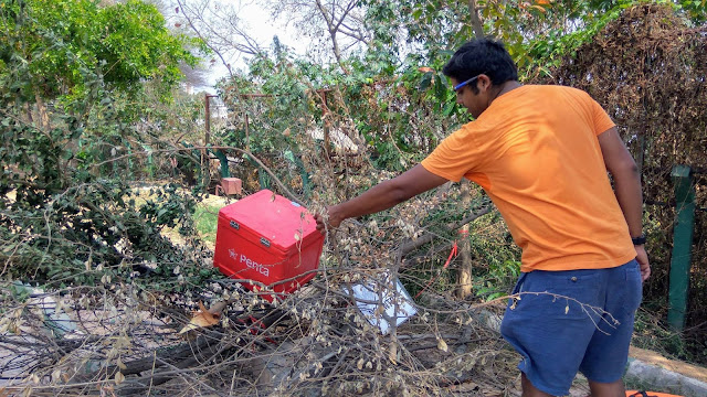The path to the next sewage inlet was blocked (intentionally) by a thicket of uprooted branches. We had to pry our way in through one side. Sid keeps the mobile lab box in the middle, to be picked up after we reach the other side.