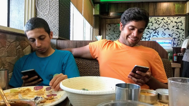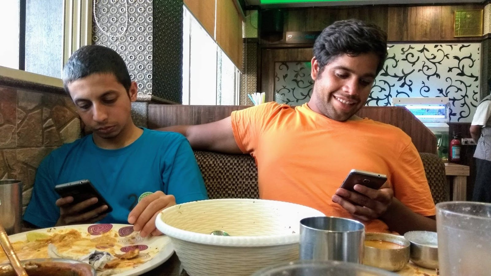 After an exhausting day, we went to nearby Nandini’s for lunch – at around 4 pm. Sayan and Sid catching up with the world.
